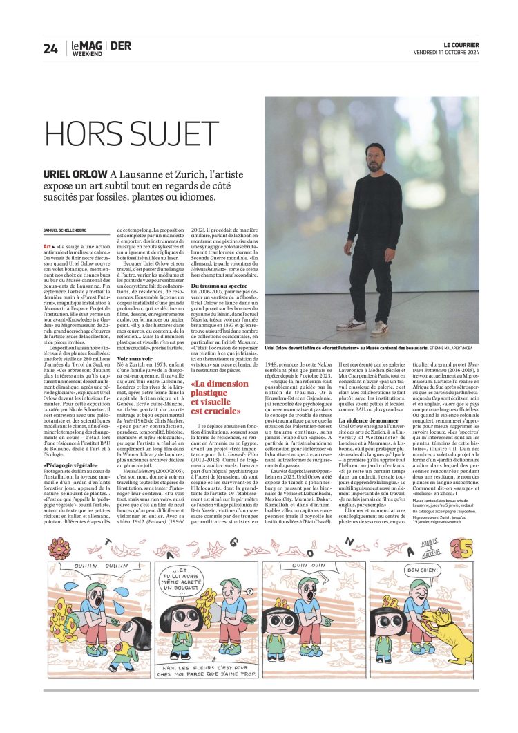 Samuel Schellenberg for Le Courrier on Uriel Orlow Forest Futurism exhibtion at MCBA Lausanne, and Knowledge is a Garden at Migros Museum, Zurich.