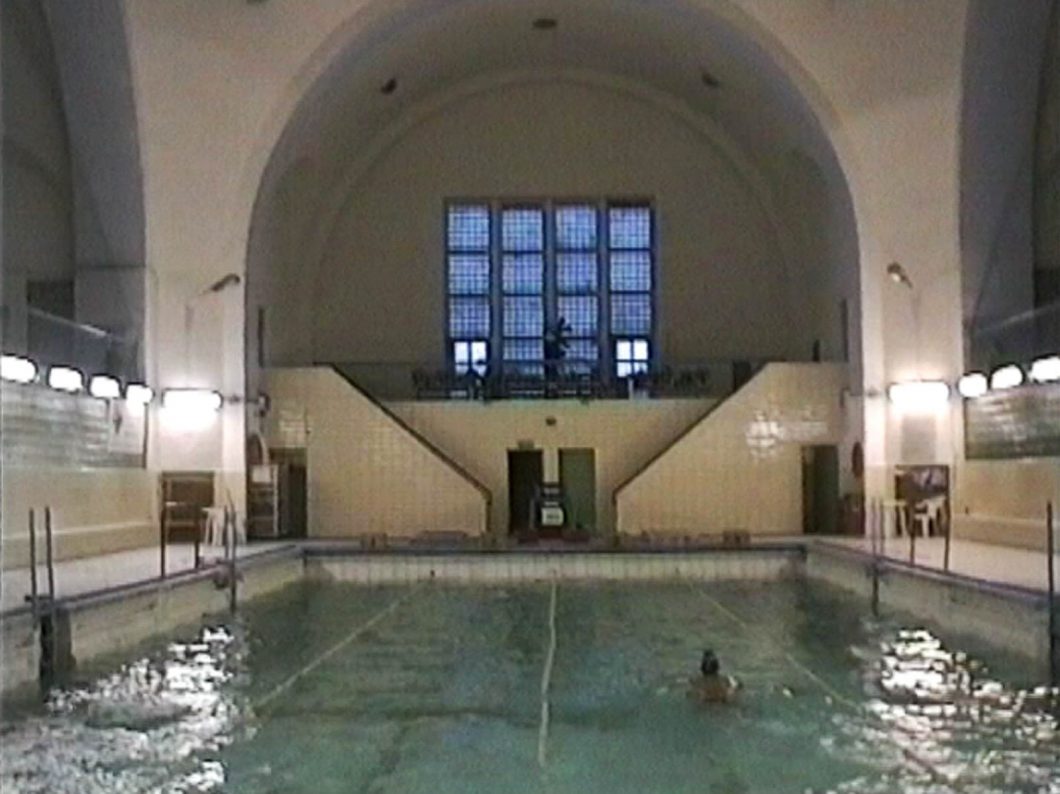 “As the video projection begins, we see a tiled floor. The camera rises in a vertical pan to show a swimming pool with a lone swimmer. We hear singing in Hebrew: it is the mourning prayer, ‘Aw Harakhamim’ (sung by the former cantor of the Jewish community in Szeged, Hungary). The camera continues its steady, inexorable movement, and the viewer who is familiar with Jewish places of worship begins to see, in the austere and beautiful symmetry of the building, the structure of a synagogue, with its seating area over the main door, and vaulted ceiling. The title, 1942 (Poznan) contains the clue: the site is the Poznan Synagogue, converted into a swimming pool by the Nazis in 1942.