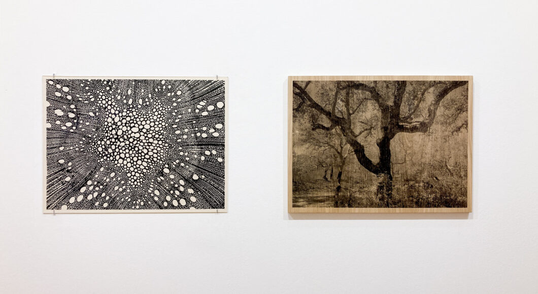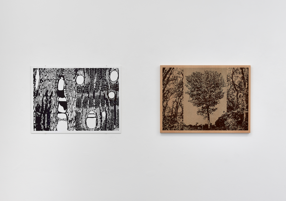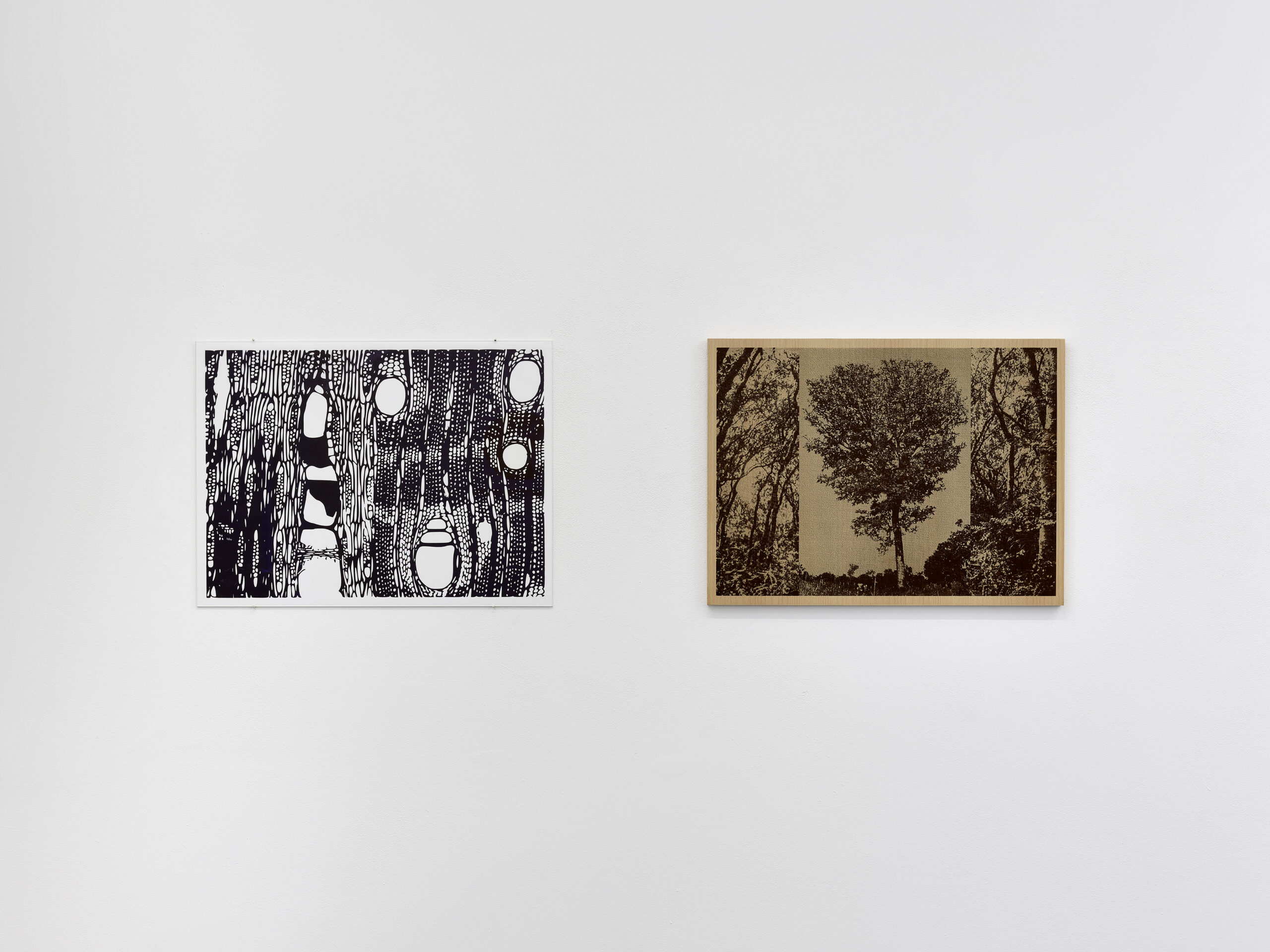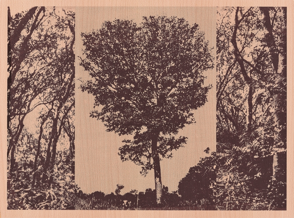 Based on representations of the tree species Daniellia oliveri, which originates from Guinea-Bissau, Forest Essentials Take Two / Close-Up (Bóbe) reproduces microscopic images of the wood fibres as a wood print on paper, while Forest Essentials Take Two / Long Shot (Bóbe) shows a silkscreen on beech wood combining archive photographs of dense Daniellia oliveri vegetation and an isolated tree. The tree species reflects the holdings of the Lisbon Wood Library, which were mainly expanded between the 1940s and 1960s through expeditions to Portugal’s African colonies and were accordingly used for research into exotic tree species. From the forest to the wooden board and from the fibre structure to the paper, the work counterpart accomplishes a multi-layered shift from the large to the small, from the material to the useful, from the historical archive to the contemporary print.