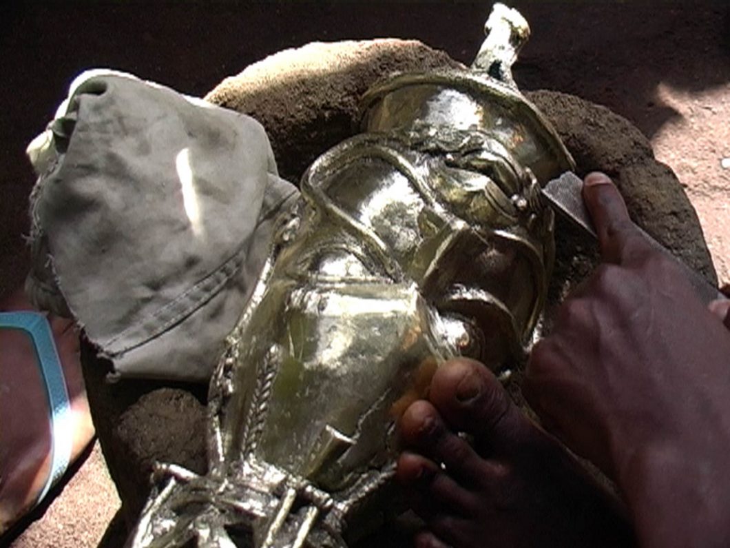 Lost Wax shows artists at work in the traditional brass-casting district in Benin City (Nigeria), using the ancient lost wax technique (cire perdue) and recycled metal from the West to produce metal cast artefacts. The newly produced artworks are in an uneasy relationship with the Western-dominated market that maintains a self-interested and arbitrary divide between authentic (pre-1897) objects and ‘cheap’ reproductions, destined for lovers of ‘African’ art or seen to be ‘flooding the market with fakes’. However, even if the new casts are in the historical style of those famously looted by the British in 1897, they are not reproductions, as each cast is a unique work of art.
