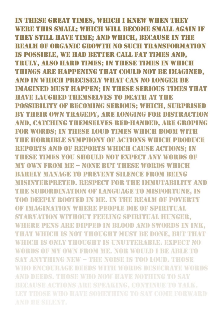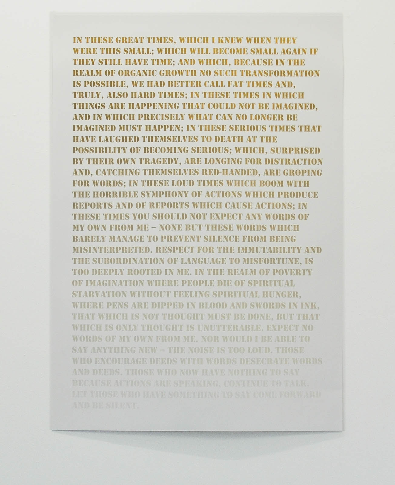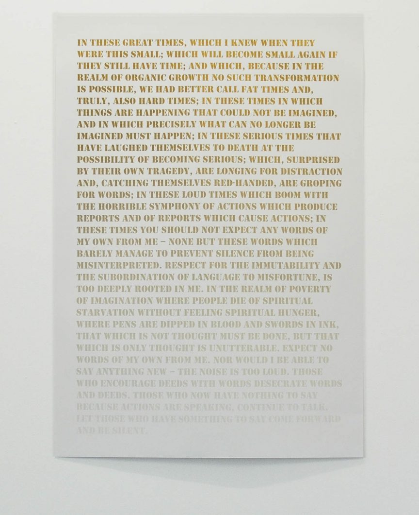 Work Silent Silkscreen print with gold ink, 89.5cm x 128 cm, 2008 In These Great Times: Project In These Great Times: Works Video Old Haunt 2009 Drawing Oddly, one lived the war in one’s mind more intensively than at home in a country at war 2009 Video The Noise is Too Loud 2008 Video Ornament And Crime 2008 Video Three Hours and Twenty-Five Minutes 2008 Video Entre Chien Et Loup 2008 Photography Ruins 2008 In These Great Times: Publications Oddly Frieze | Felicity Lunn | January 2009 Mike Sperlinger | In These Great Times | 2008